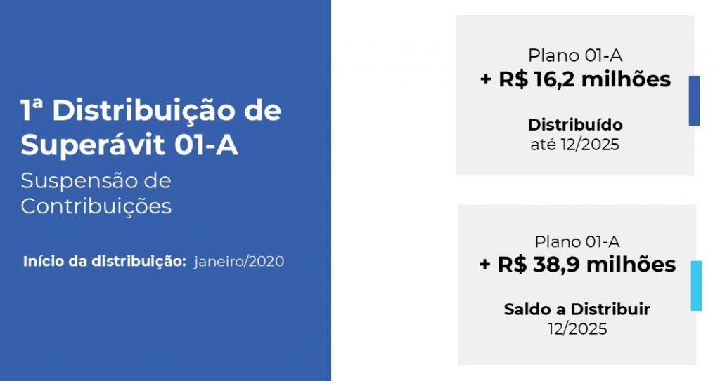 A primeira distribuição de superávit teve início em abril de 2020 e adotou como principal mecanismo a suspensão de contribuições. Até dezembro de 2025, foram distribuídos aproximadamente R$ 16,2 milhões, permanecendo um saldo de R$ 38,9 milhões a distribuir naquele momento.