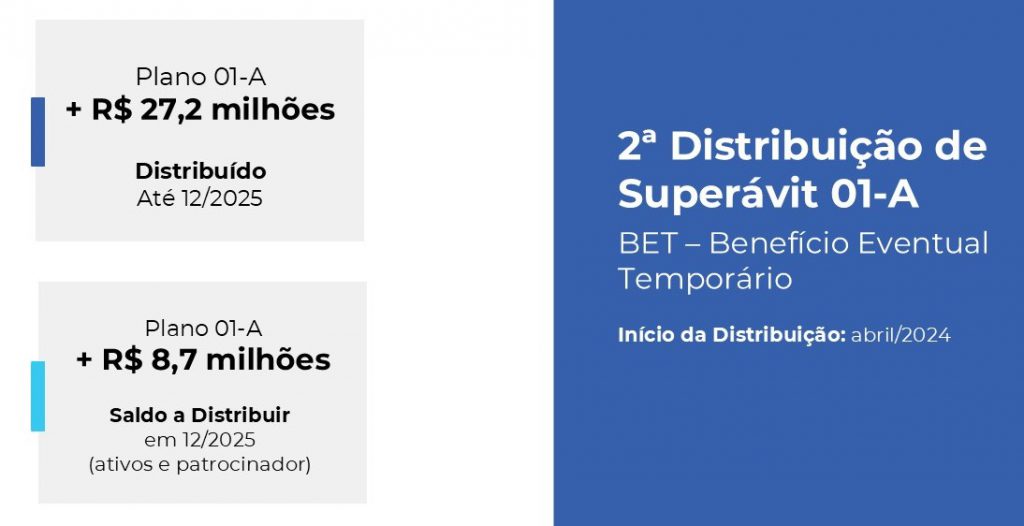 A segunda distribuição começou em abril de 2024, já no formato de Benefício Eventual Temporário (BET), contemplando ativos e patrocinador. Até dezembro de 2025, foram distribuídos cerca de R$ 27,2 milhões, com um saldo residual de R$ 8,7 milhões ainda previsto para distribuição.