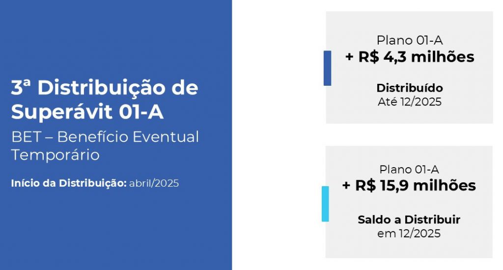 A terceira distribuição de superávit foi iniciada em abril de 2025, também por meio de BET. Até o final de 2025, houve a distribuição de R$ 4,3 milhões, permanecendo um saldo de R$ 15,9 milhões a ser distribuído. Essa fase reforçou a continuidade do processo de devolução do superávit, respeitando a capacidade financeira do plano.