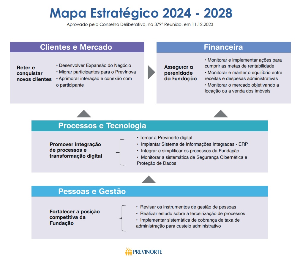 Veja, a seguir, o Mapa Estratégico da Previnorte para o ciclo 2024-2028: