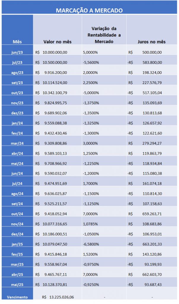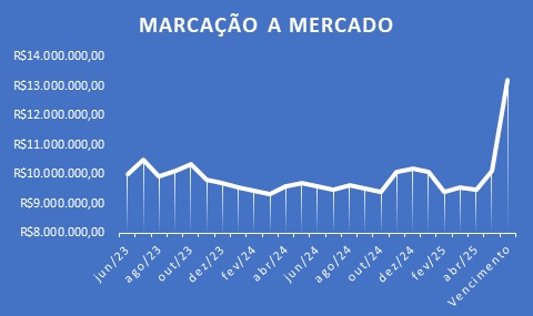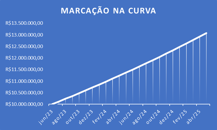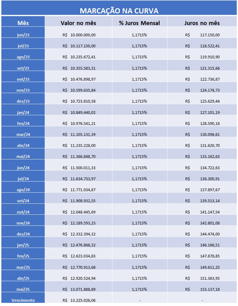 Na marcação na curva o ativo será precificado considerando um pedacinho de juros a cada mês. Ou seja, se a Previnorte contratou o título de nosso exemplo em maio/2023, este título terá uma evolução mensal crescente com juros mensais, mais ou menos da seguinte lógica: